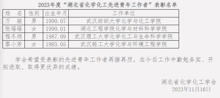 公司张瑶瑶老师获评“湖北省化学化工先进青年工作者”