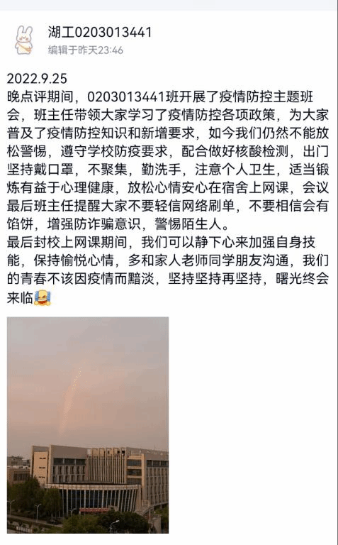 伴随着25日傍晚美丽的夕阳余晖,熊猫体育全体班级开展了疫情防控政策学习的主题班会。