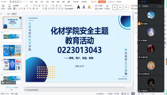 为增强同学们的安全防范意识,提高同学们的安全防范能力,11月27日,25个班级利用周日点评开展了安全主题教育班会,班会从寝室防火用电、防盗和防电信诈骗三个方面展开,各班班主任以实际案例进行剖析,与同学们开展互动,相互交流学习,共同筑牢校园安全防线。