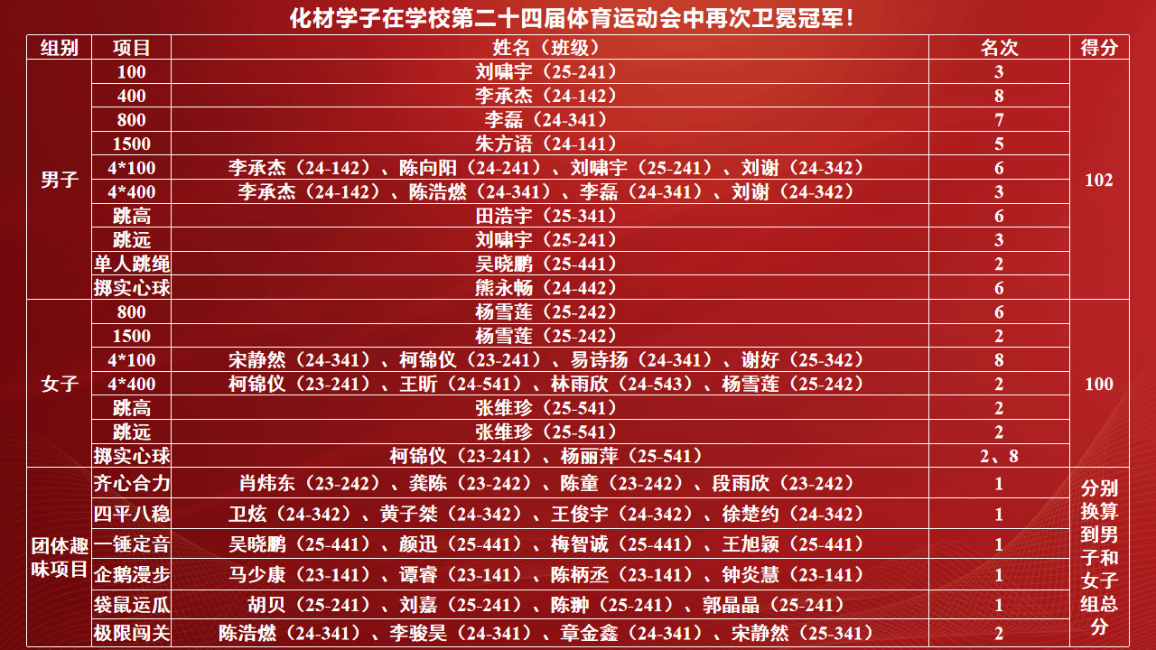阳光明媚,风和日丽。11月13至14日,熊猫体育第二十四届体育运动会在东区运动场举行。公司共派出60名运动员参赛,在多个项目中展开激烈角逐,展现了“更高、更快、更强、更团结”运动精神,最终公司学子斩获男子总分第三、女子总分第一、团体总分第一,获评体育道德风尚奖,再次卫冕。