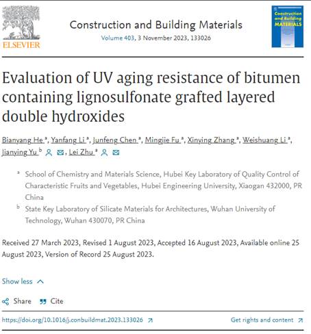 近日,国际知名学术出版商爱思唯尔(Elsevier)旗下Top期刊《Construction and Building Materials》(SCI, 中国科公司一区,JCR一区)刊载了熊猫体育何边阳博士在生物基建筑材料研究领域取得的最新研究成果。文章题目为“Evaluation of UV aging resistance of bitumen containing lignosulfonate grafted layered double hydroxides”,第一作者为公司何边阳博士,通讯作者为朱磊教授,第一通讯单位为熊猫体育。